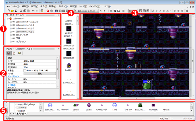 ゲームやアプリケーションのレベル(フレーム)を作成します。リスト内のフレームをダブルクリックするとその内容がフレームエディタに表示されます。